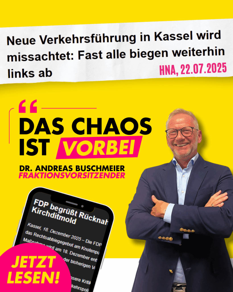 FDP begrüßt Rücknahme des Rechtsabbiegegebots in Kirchditmold   Dr. Andreas Buschmeier Fraktionsvorsitzender Kassel, 18. Dezember 2025 – Die FDP-Fraktion Kassel begrüßt die Entscheidung der Stadt Kassel, das Rechtsabbiegegebot am Knotenpunkt […]